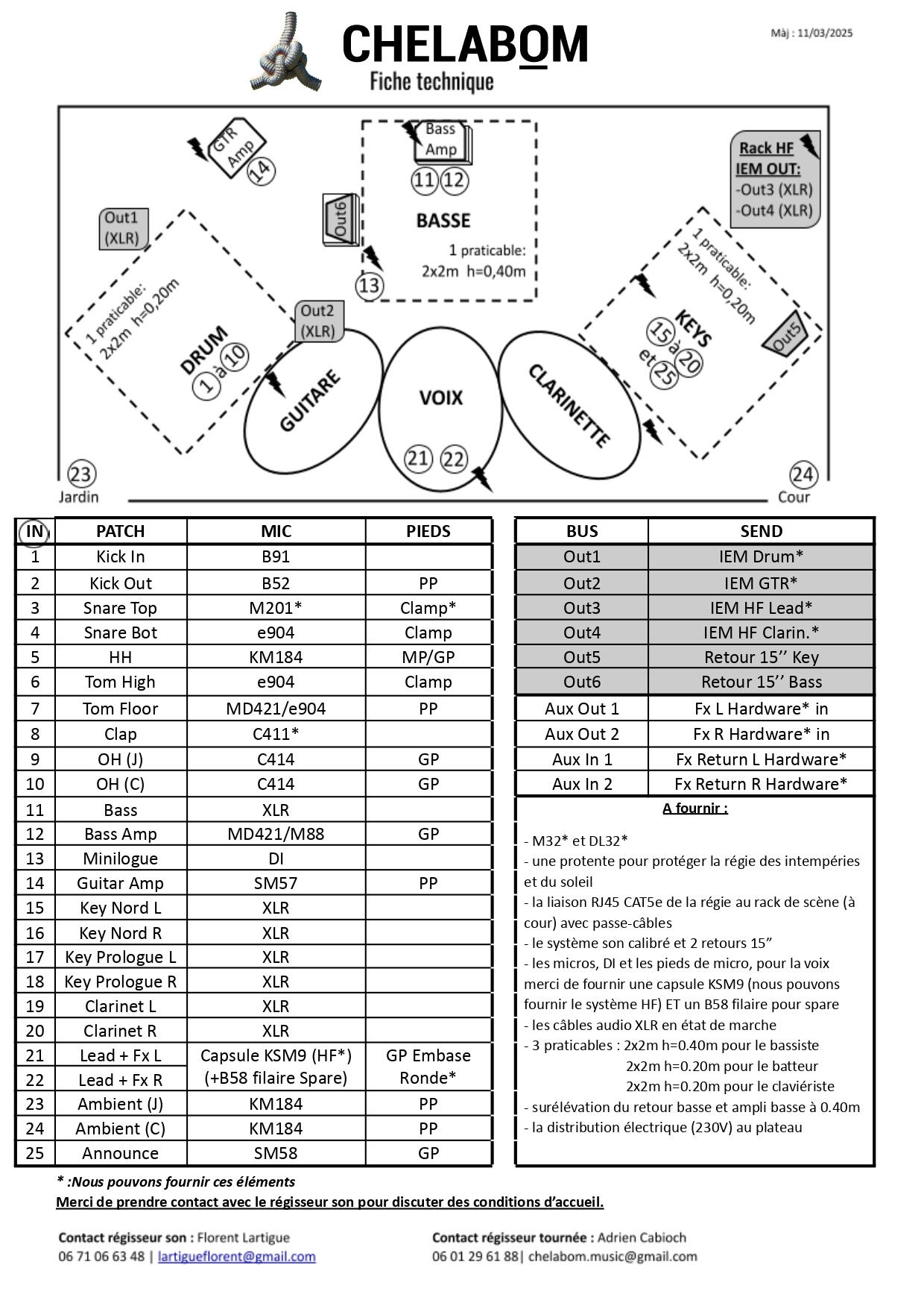 CHELABÔM, c’est un univers musical atypique porté par la sensibilité envoûtante de six musicien.ne.s. Il assume, non sans difficulté, sa démarche collective et horizontale rejetant la notion de lead unique souvent imposée au chant. Le groupe s’applique à créer une dynamique d’échanges à la fois dans le travail et l’objet musical. Cette intention politico-artistique s’incarne aussi bien sur scène qu’en studio. Elle se ressent dans leurs morceaux, tant par l’arrangement de mélodies à la fois délicates et tonitruantes, qu’aux travers de textures étonnamment organiques et minérales où les solos s’entremêlent au sein d’un ensemble dense et puissant.Le projet se démarque aussi à travers l’énergie communicative de la chanteuse. Voix - instrument, elle joue avec les langues et les accents, pour aujourd’hui chanter des histoires en français et y exprimer sa poésie. On y retrouve l’influence de figures hypnotisantes telles que Nathy Peluso, Bonnie Banane ou Catherine Ringer. Aujourd’hui riche de près de 150 dates, le groupe vient de produire un album qui concrétise l’originalité du groove CHELABÔM. « DEFILE-MOI », comme une invitation à explorer la nébuleuse musicale du groupe. Le projet déroule ses textes et ses paysages sonores où il est question d’influences, de jeux d’échelles et de rapport complice et sensuel au monde vivant.